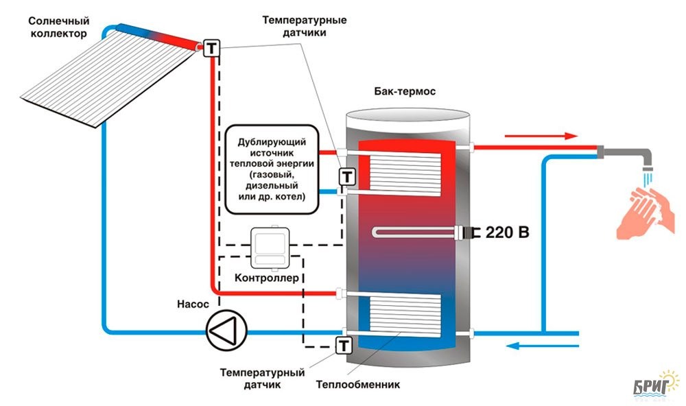 Солнечное тепло накапливается в первом контуре, в котором циркулирует антифриз. Затем в теплообменнике оно передаётся во второй контур (резервуар с водой).